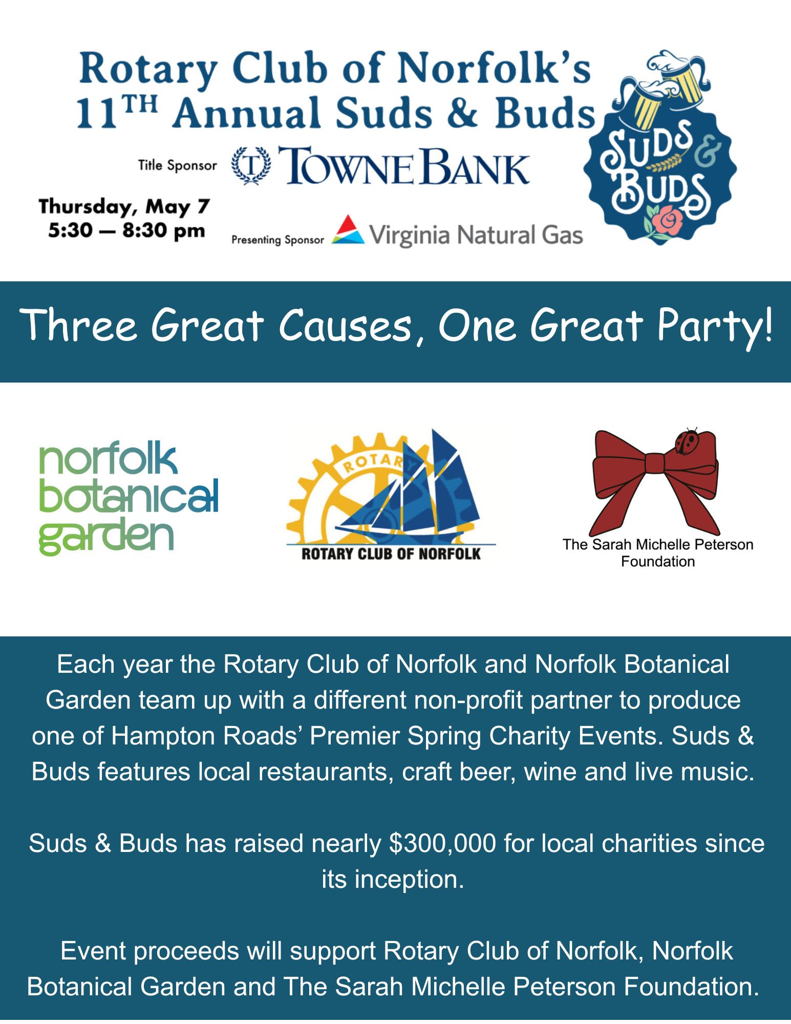 Each year the Rotary Club of Norfolk and Norfolk Botanical Garden team up with a different non-profit partner to produce one of Hampton Roads’ Premier Spring Charity Events. Suds & Buds features local restaurants, craft beer, wine and live music. Suds & Buds has raised nearly $300,000 for local charities since its inception. Event proceeds will support Rotary Club of Norfolk, Norfolk Botanical Garden and The Sarah Michelle Peterson Foundation.
